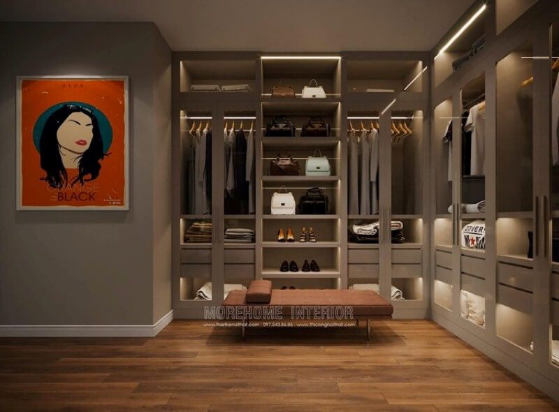 Không đơn thuần chỉ là một căn phòng để đồ đơn điệu của căn hộ chung cư, nhà phố, biệt thự mà nhà thiết kế rất sáng tạo khi thiết kế hai tủ đồ gỗ cánh kính hiện đại hai bên tường, vừa tận dụng được không gian mà còn thể hiện tính thẩm mỹ cao.
