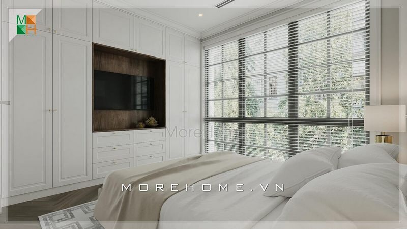 Hệ thống tủ quần áo âm tường hiện đại được bố trí thông với không gian phòng ngủ nhưng bạn vẫn cảm nhận thấy sự thoáng đãng, tinh tế đầy ấn tượng.