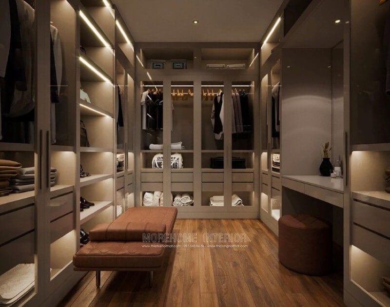 Tủ quần áo hình chữ U sử dụng gỗ công nghiệp acrylic sáng bóng cao cấp đồng màu mang lại vẻ đẹp sang trọng cho phòng thay đồ