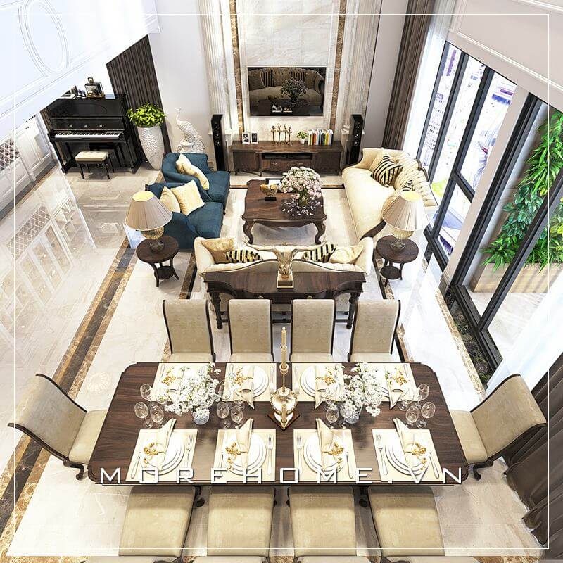Bố trí phòng ăn liền phòng khách đẹp, sang trọng ấn tượng với sắc xanh nổi bật từ bộ bàn ghế cùng lối thiết kế nội thất tân cổ điển quý phái.